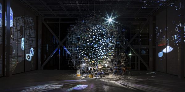 Running from October 24th 2020 to May 30th 2021, Night into Day showcased pieces from her Timekeeper series. The physical centrepiece of the show was Twice Twilight, the ‘suggestion of a sphere’ defined with torn paper, photographs, and debris, held together with bamboo and metal rod scaffolding that was further enhanced with projected images. The gallery itself is practically a giant glass box that blurs the line between inside and out, Sze’s original sketches and concept art showed exactly how she wanted to use these facades to her advantage and amalgamate them into the installation.
