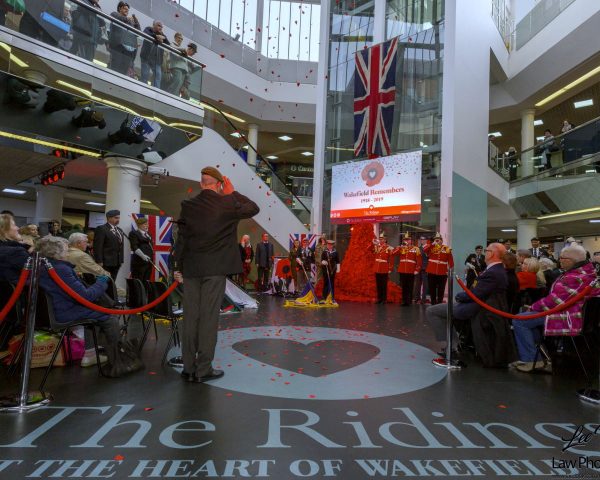 The Ridings held the service on the morning of the 9th of November in the company of veterans, standards, Wakefield Cathedral staff and councillors. The touching ceremony began with a parade down the mall, with the march ending in the atrium after moving readings from guest speakers. The atrium space was beautifully decorated with union jacks and armed forces uniforms from the past and present. Perhaps the most stunning feature, was the cascade of handmade poppies flowing beneath our front projection screen, all carefully handmade by members of the community. After the bugler sounded the last post marking the two minutes silence, poppy petals began to fall from the ceiling, marking a perfect end to a truly thoughtful service.