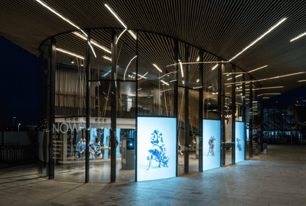 Specialist projection screens are a particular favourite too, with Pro Display offering a range of projection options that can help the artist or designer achieve the ideal picture, whether they require a solution that provides high contrast, high gain or even ambient light rejecting properties. London’s prestigious NOW Gallery offers passers-by a high impact visual taste of the standard of art they should expect using 3 projection screens comprising of Pro Display’s High Gain Projection Film, which was installed in a portrait format onto their exterior facing glass façade. Using these screens, NOW Gallery are able to project images with breath-taking clarity and 4K resolution; producing sharp pictures with inherently high brightness and optimum contrast. Installing such screens in this location makes for incredibly versatile fixtures that can be used for whatever advertising purposes required, from advertising events, special offers, providing information or simply to just advertise a specific exhibition.