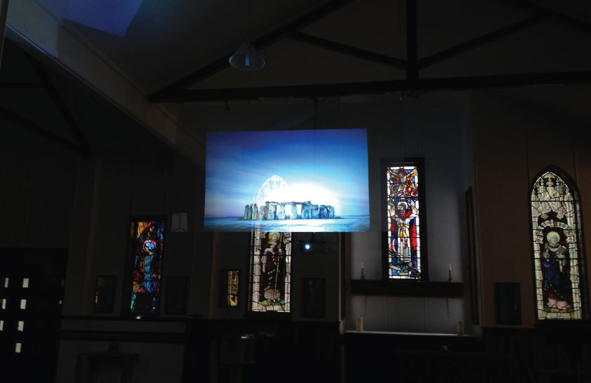 The switchable projector screen solution enables the church to keep the screen in a prime viewing location, whilst providing an unobstructed view of the beautiful stained glass windows behind it when not in use.