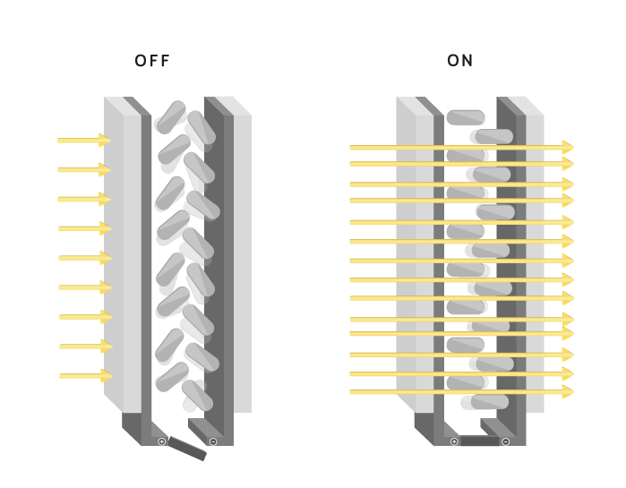 PDLC technology comprises a liquid crystal interlayer sandwiched between ITO and PET film layers. In it’s off (frosted) state the liquid crystals are scattered in a way that causes light waves to refract and reflect away from the surface. When an electrical current is applied the liquid crystals then align allowing light to pass through (transparent).