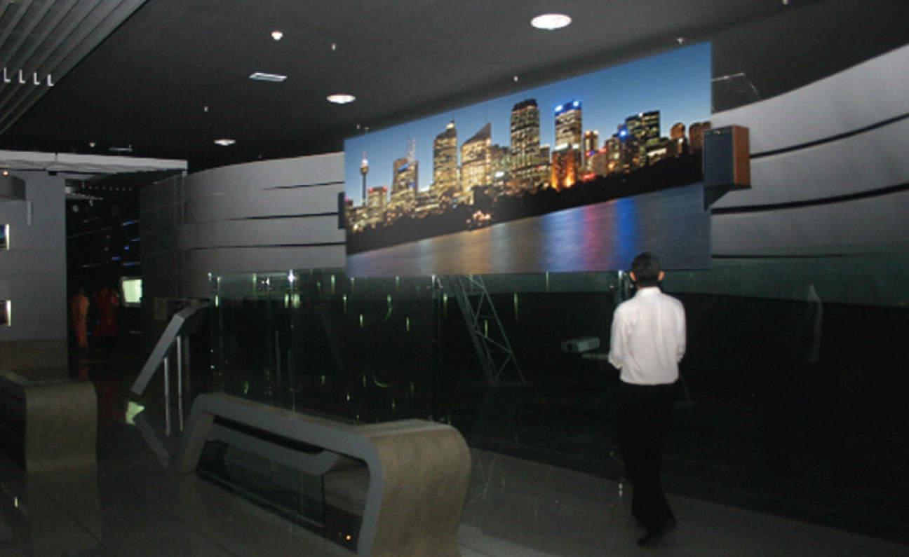 A double sided projection screen can be projected on from both sides, displaying 2 different images without needing more space. Both sides of the screen are casted with a specialist optical surface, dispersing light evenly across either side of the screen to display multiple HD/4K images.