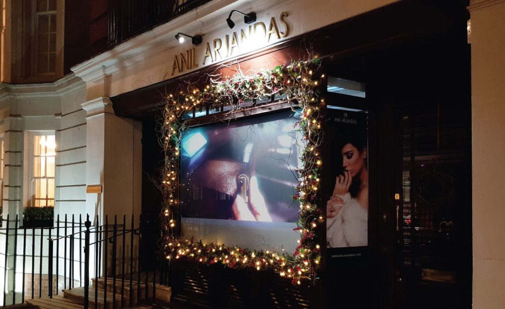 This technology has been cleverly used before with luxury jeweller, Anil Arjandas, using our switchable film on their store front allowing passers by to see the jewellery on offer during opening hours, but once closed the film was switched to frosted to create a HD/4K projection advertising display that also added a layer of security and theft deterrent to the store itself.